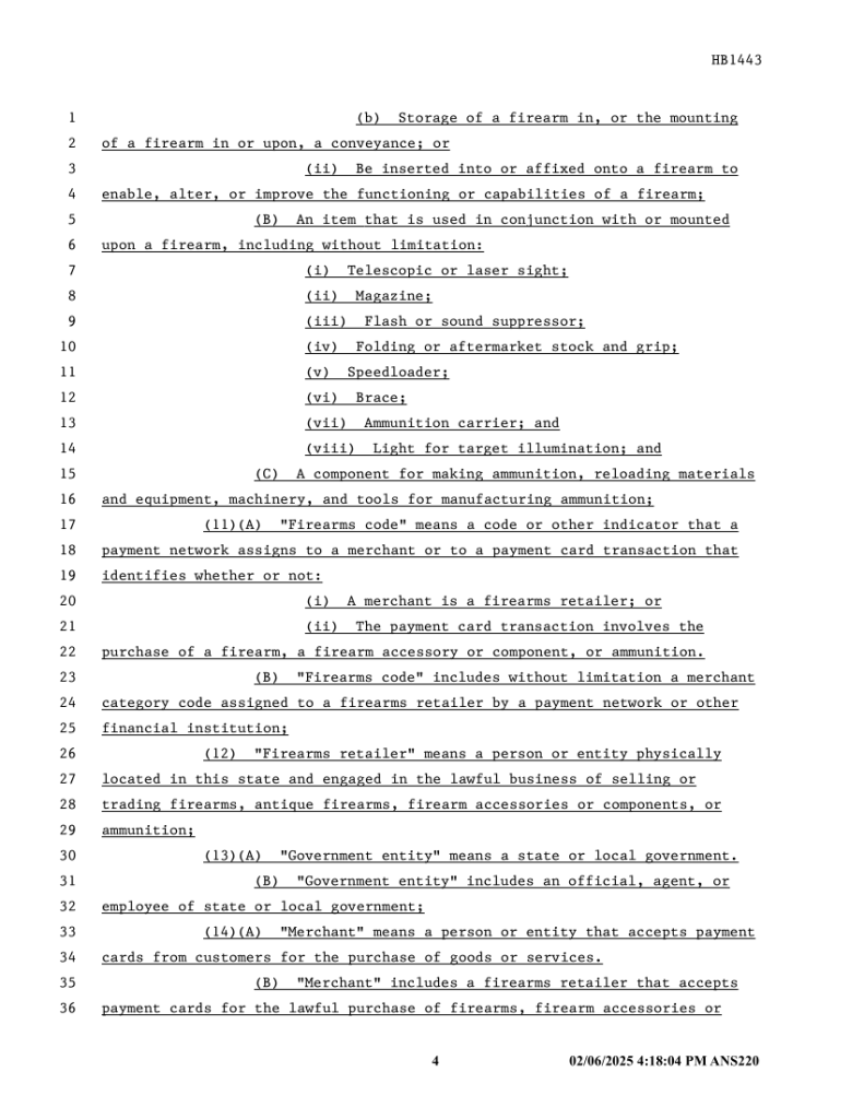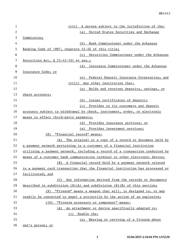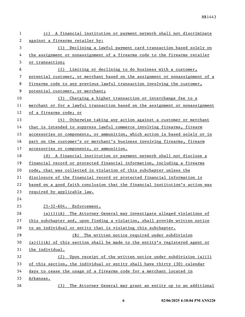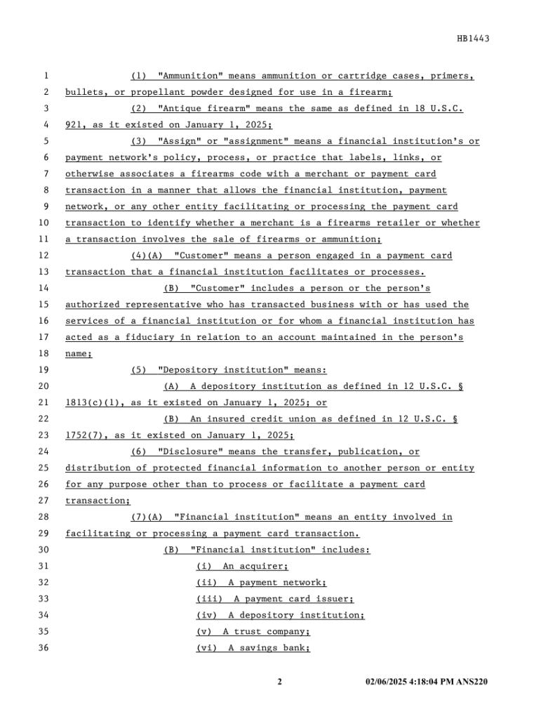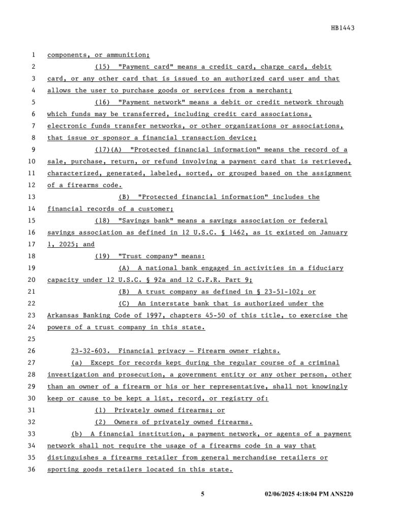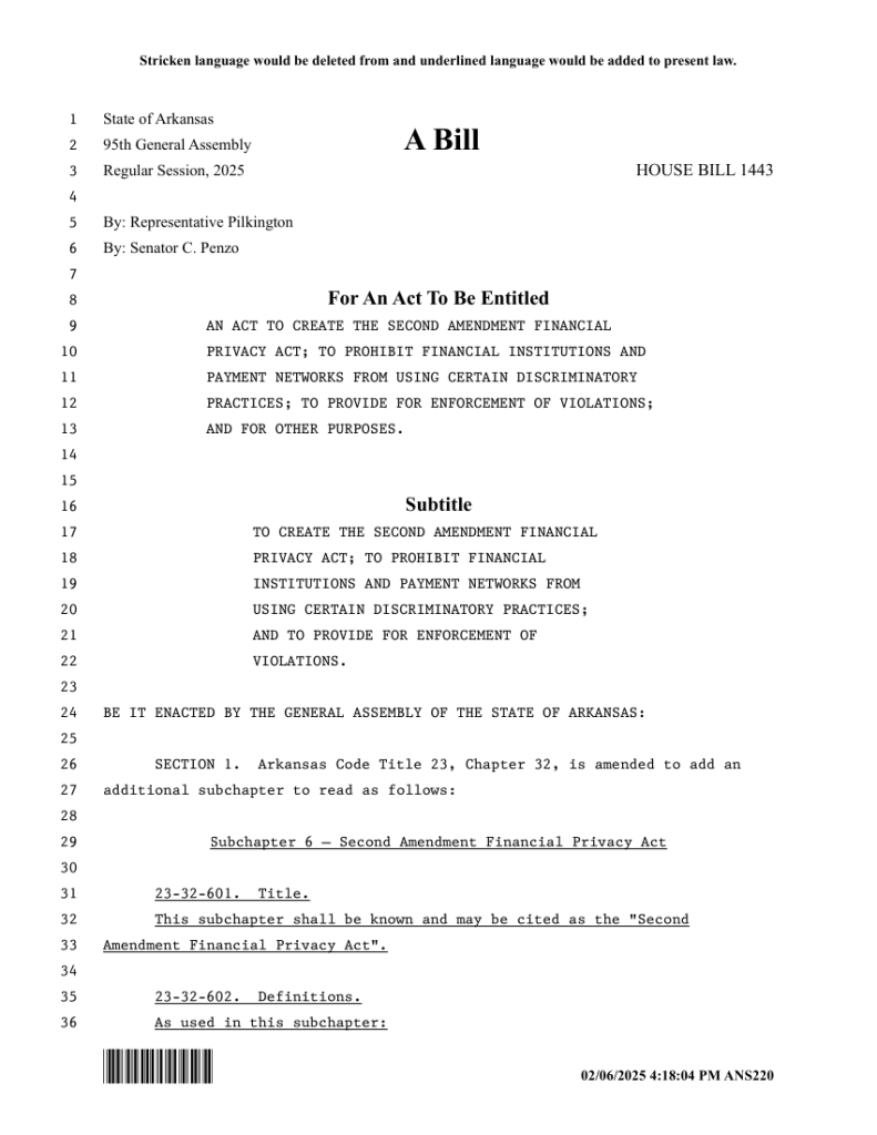 TO CREATE THE SECOND AMENDMENT FINANCIAL PRIVACY ACT; TO PROHIBIT FINANCIAL INSTITUTIONS AND PAYMENT NETWORKS FROM USING CERTAIN DISCRIMINATORY PRACTICES; AND TO PROVIDE FOR ENFORCEMENT OF VIOLATIONS.